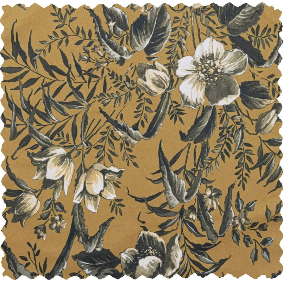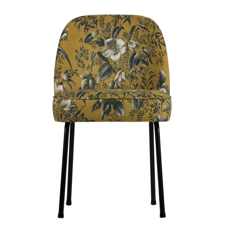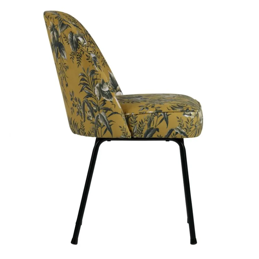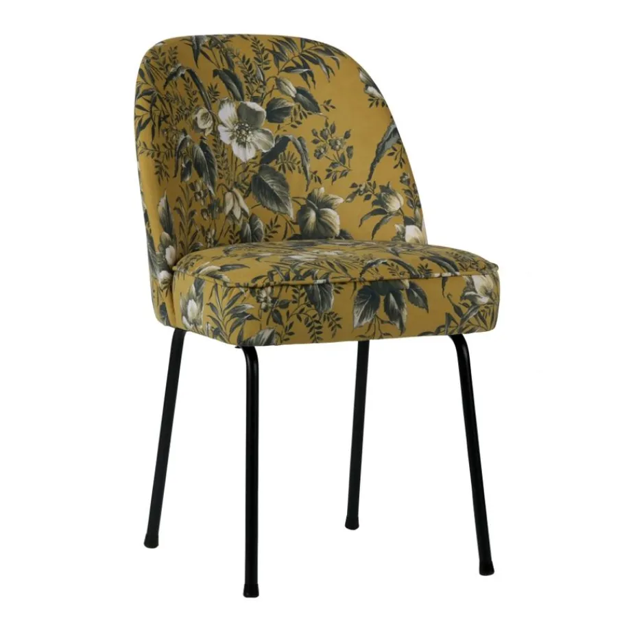 Deze mooie stoel is bekleed met een zachte velvet stof in de kleur Poppy Mustard, een okergele kleur met een multi color bloemenprint. De stof is gemaakt van 100% polyester, een stof die niet snel verkleurt of verslijt.