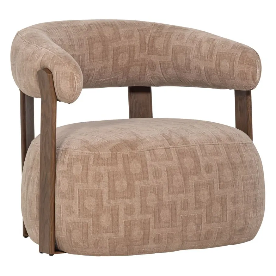 Fauteuil Foon brengt met zijn robuuste ontwerp en zachte rondingen een serene sfeer in elke ruimte. Het zichtbare houten frame vormt een stijlvol contrast met de zitting en de rugleuning, die bekleed zijn met een stof met een subtiel patroon. Door de neutrale zandkleur is deze fauteuil eenvoudig te combineren binnen uiteenlopende interieurstijlen, van modern tot landelijk.
