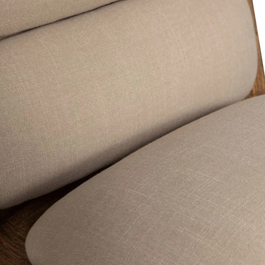 De kussens zijn bekleed met bouclé, een sterke stof met een rijke structuur. De naturel kleur is een neutrale tint die goed combineert met het hout en zorgt voor een sfeervolle look.