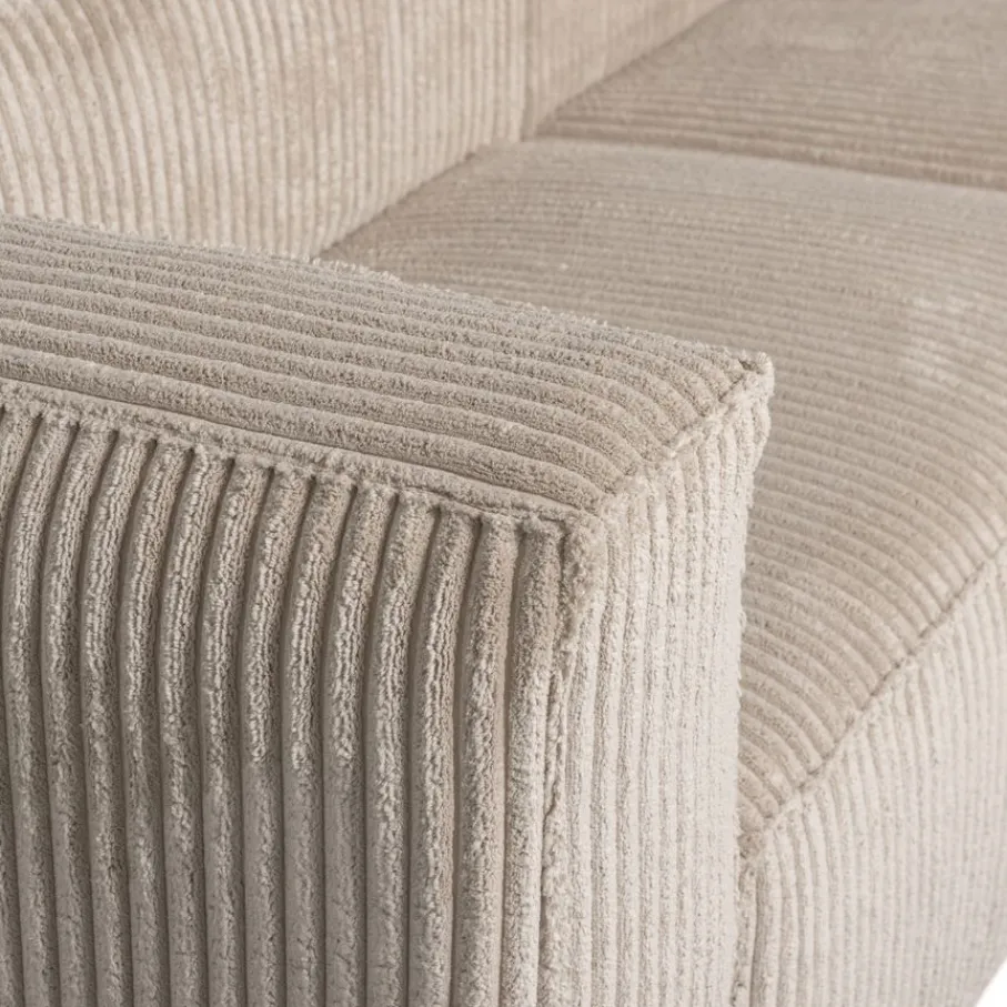 De Bean bank is gestoffeerd met een grove ribstof die heerlijk zacht aanvoelt. Het is een geweven polyester stof met een hoogpolige ribstructuur en de achterzijde is verstevigd met een strak geweven backing. Met een Martindale van 30.000 is de stof zeer slijtvast en de perfecte match voor jouw zitmeubel. De kleur Travertin is een elegante beige tint die makkelijk combineert.