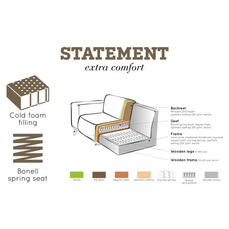 Het zitcomfort van Statement is duurzaam en stevig. De zitting van de bank heeft een bonell vering afgedekt met een schuimlaag en wattendek voor extra zitcomfort. De rugleuning is gevuld met een koudschuim met een goed ademend en terugverend vermogen. De zithoogte is 45 en de zitdiepte is 63 cm. De hoogte van de armleuning is 65 cm en de breedte van de armleuning is 24 cm. De poothoogte is 15,5 cm.
