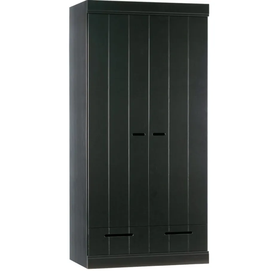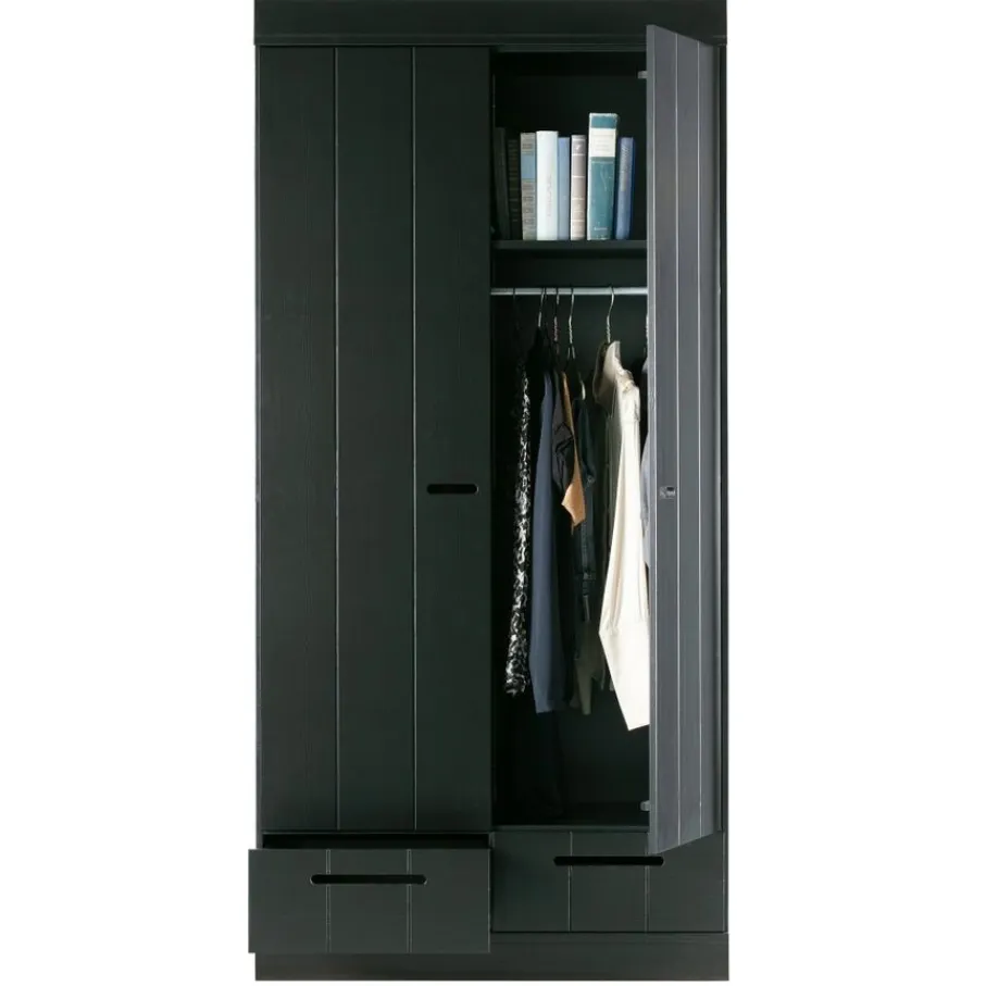 In kledingkast Connect zit 1 legplank met daaronder een roede. Onderin zitten 2 laden voor extra opbergruimte. Voeg de extra Connect kastindeling toe. Die zorgt voor een halvering van de breedte van de roede en voegt 2 smalle legplanken toe.