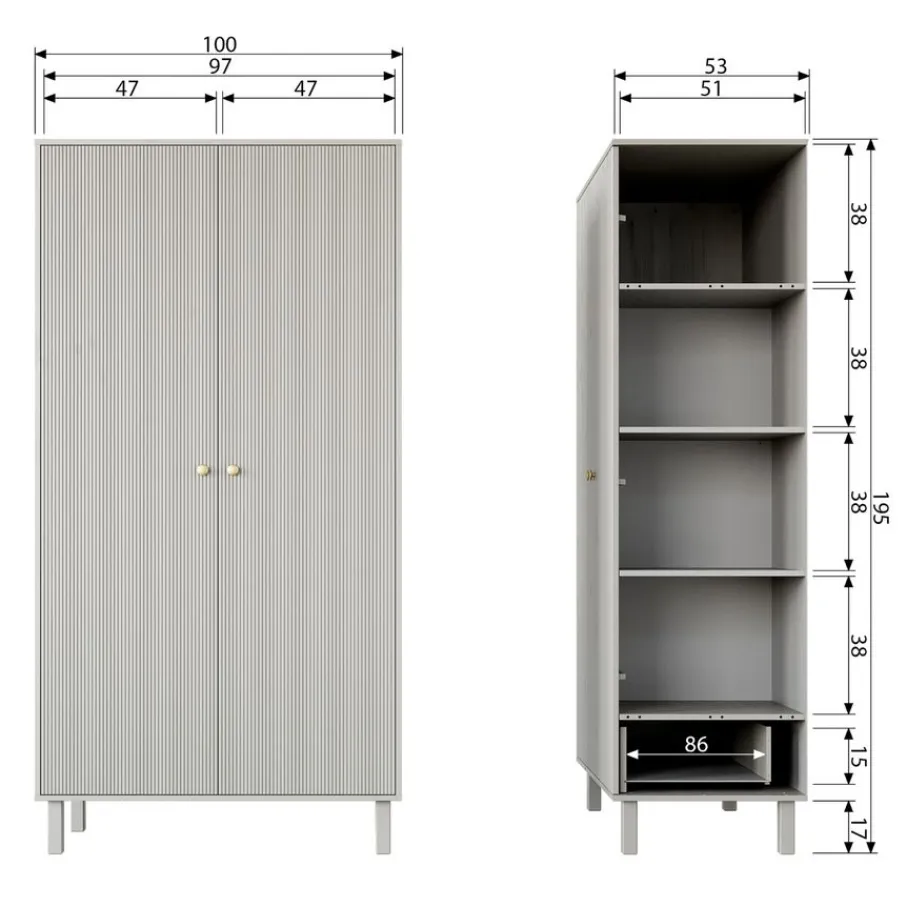Kledingkast Madu heeft 2 deuren met goudkleurige knopjes. Achter deze deuren bevinden zich 4 legplanken, een hanggedeelte en een royale lade. De ruimtes zijn 190 cm breed en 50 cm diep. Het hanggedeelte en de halve legplanken zijn 79 cm breed.