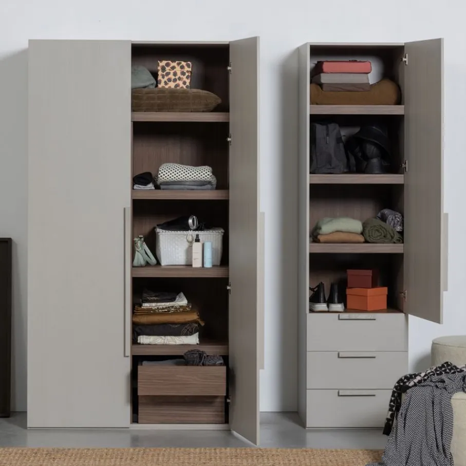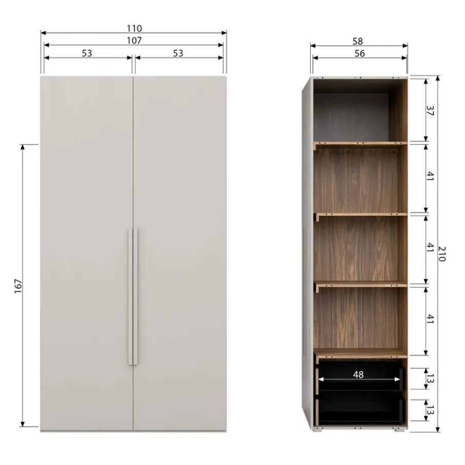 De Rens kast heeft 2 slanke deuren over de hele lengte. Daarachter bevinden zich een hanggedeelte en een gedeelte met legplanken en 2 lades. De soepele lades bieden handige ruimte voor bijvoorbeeld ondergoed en accessoires. Ze hebben een afmeting van 48×48 cm en zijn elk 13 cm hoog. Het royale hanggedeelte is 53 cm breed en 155 cm hoog. Het interieur is afgewerkt met een luxe decor van bruin notenhout.