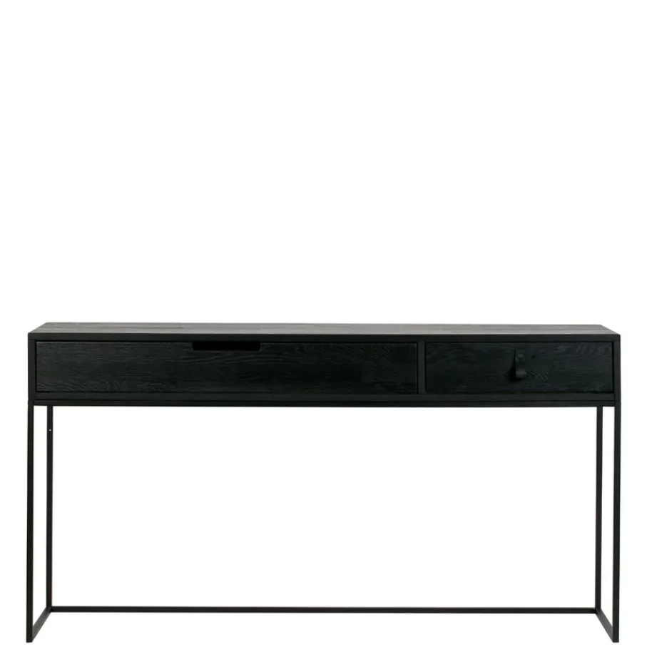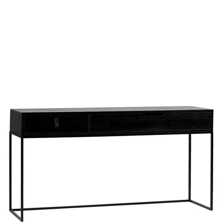 De sidetable heeft twee ruime laden, met een totale breedte van maar liefst 140 cm. De linkerlade is de grootste van de 2 en heeft een uitsparing als handvat. De rechterlade heeft een leren handgreepje.