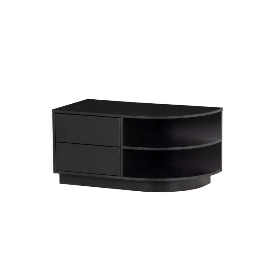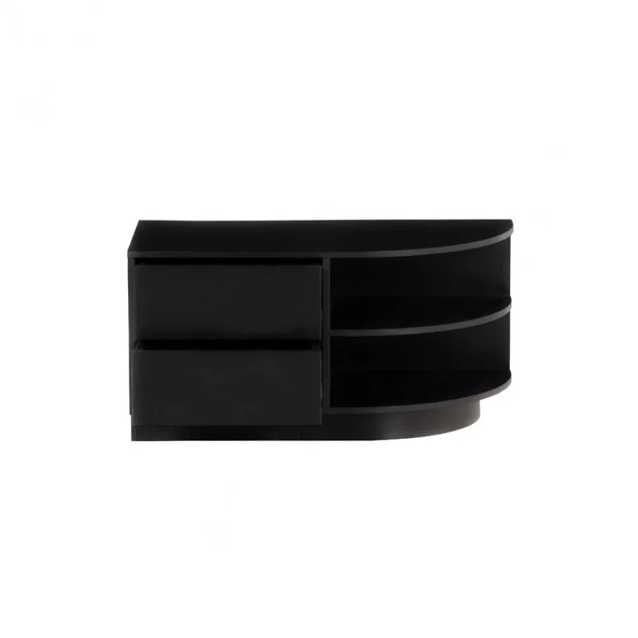 Het Finca tv meubel heeft 2 greeploze lades, deze zijn voorzien van een luxe push-to-open systeem. Iedere lade heeft een draagkracht van maximaal 10 kg wanneer het gewicht gelijkwaardig verspreid is. Aan de rechterkant zit het halfronde gedeelte met open vakken. De onderrand van het Finca tv meubel laat aan de voorzijde 7 cm ruimte, hierdoor lijkt het alsof het meubel zweeft. Dit oogt ruimtelijk en slank in je interieur.
