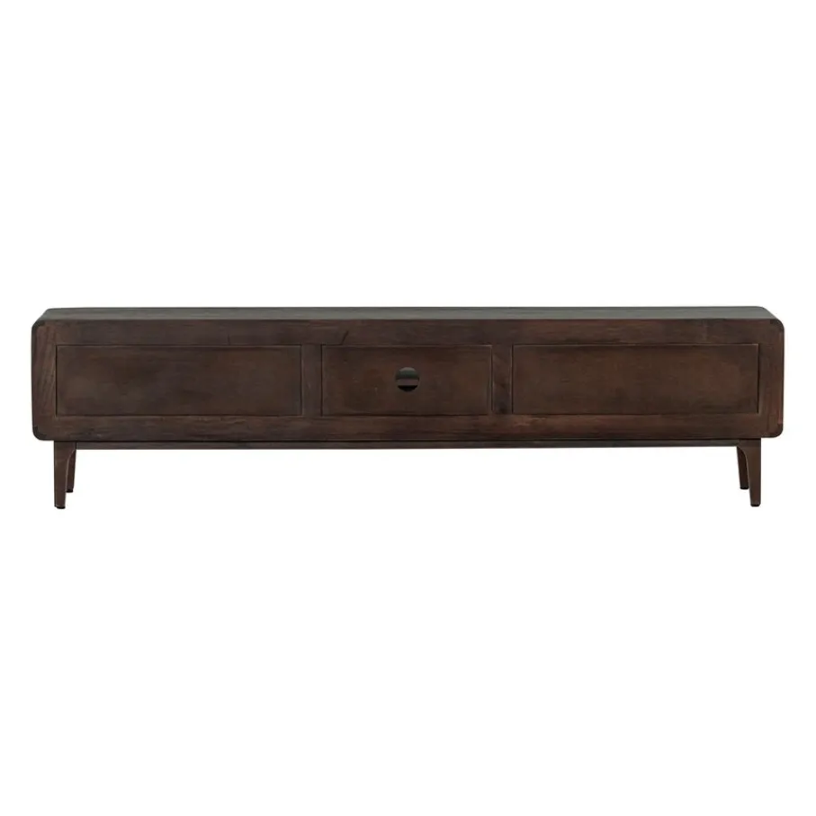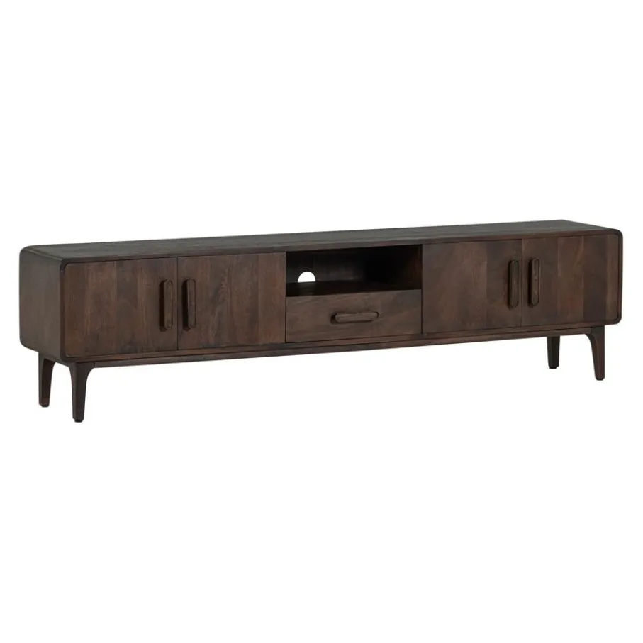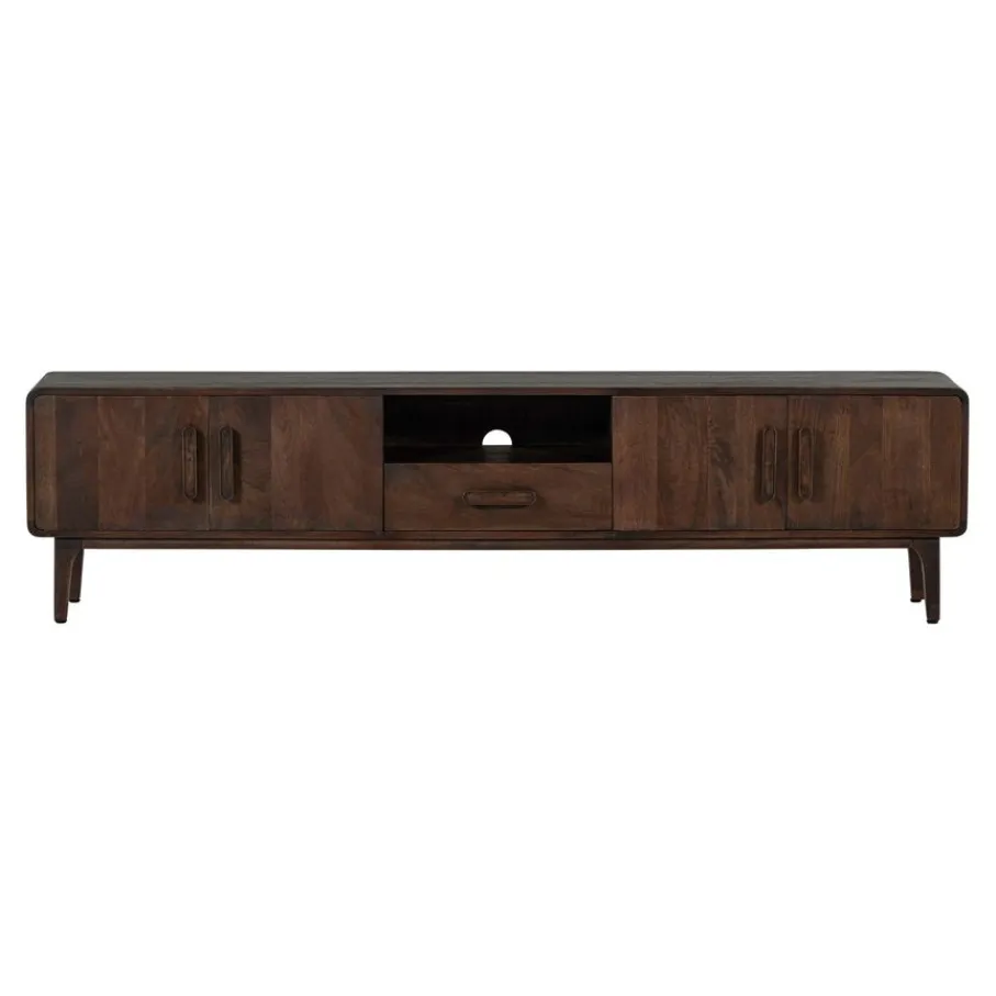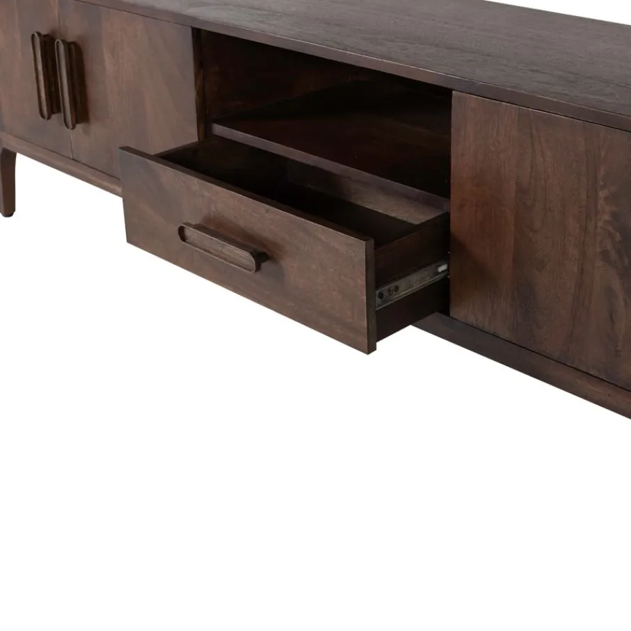 - Geef je woonkamer direct een stijlvolle upgrade met dit prachtige tv-meubel van warm mangohout, afgemaakt met elegante afgeronde hoeken en unieke houten handgrepen.