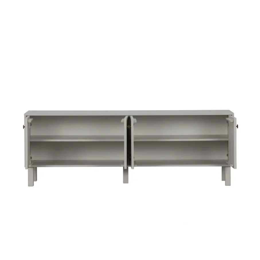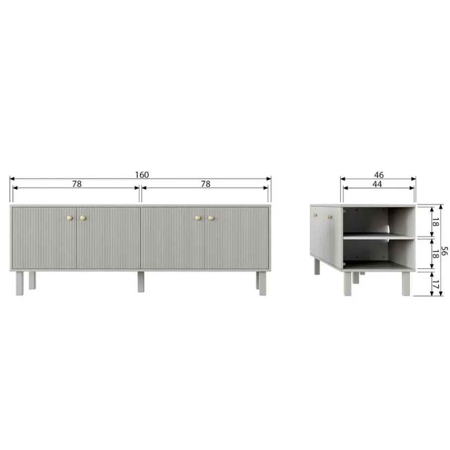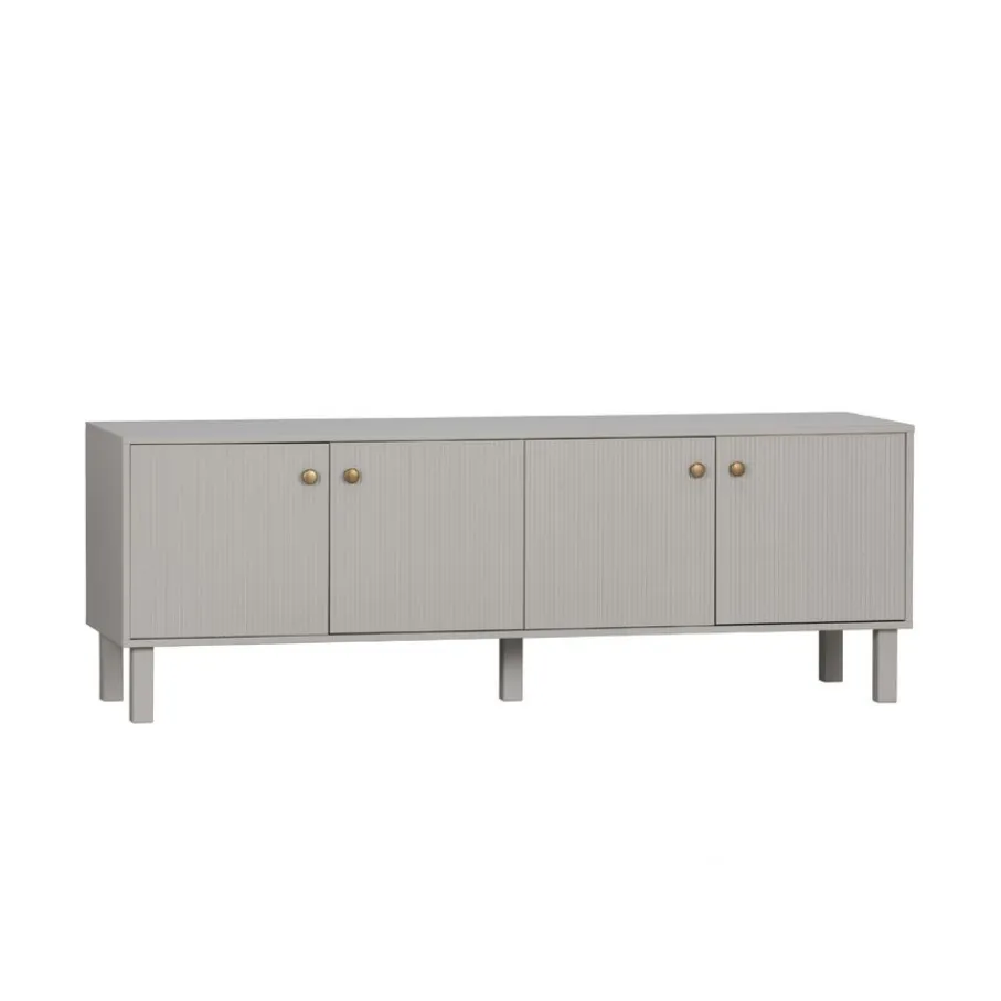 TV-meubel Madu heeft 4 deuren met goudkleurige knopjes. Achter deze deuren bevinden zich 4 legplanken. De ruimtes hebben een breedte van 76 cm en een diepte van 43 cm.