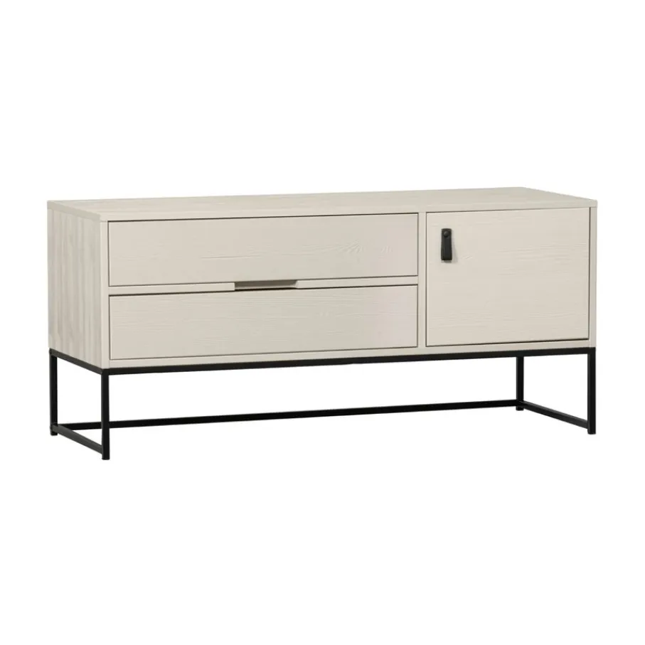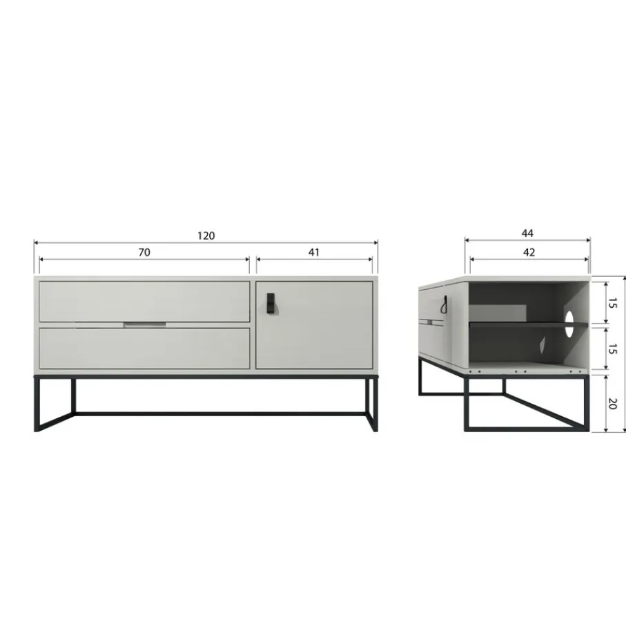 Het tv-meubel heeft twee lades van 70 cm breed en 13 cm hoog. Aan de rechterkant zit nog een vak van 41×50 cm. Hierin zit 1 legplank en wordt afgesloten met een deur. De lades hebben een zwart metalen handgreep en op de deur zit een zwart leren handgreep. Het meubel is aan de achterzijde voorzien van een gat, voor het wegwerken van kabels.