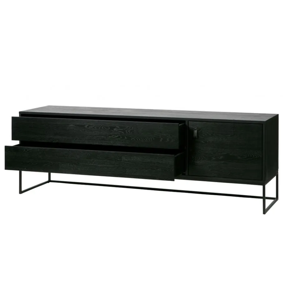 Het tv-meubel heeft twee ruime laden van maar liefst 121 cm breed en 13 cm hoog. Aan de rechterkant zit nog een vak van 41×50 cm. Hierin zit 1 legplank en wordt afgesloten met een deur met een leren handgreep.