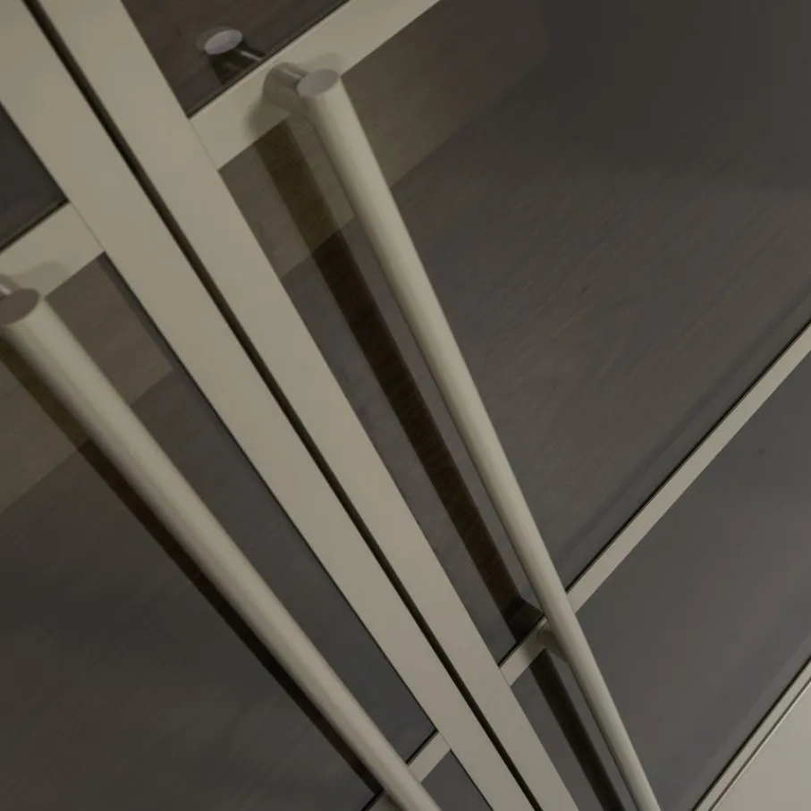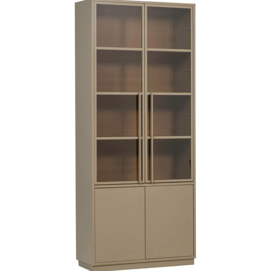 Het vitrine gedeelte biedt vier ruime vakken waarin je jouw accessoires op een stijlvolle manier kunt tentoonstellen. Achter de glazen deuren is de binnen- en achterkant uitgevoerd in een eiken decor. Het onderste gedeelte van de kast creëert juist plek voor spullen die je liever uit het zicht houdt.