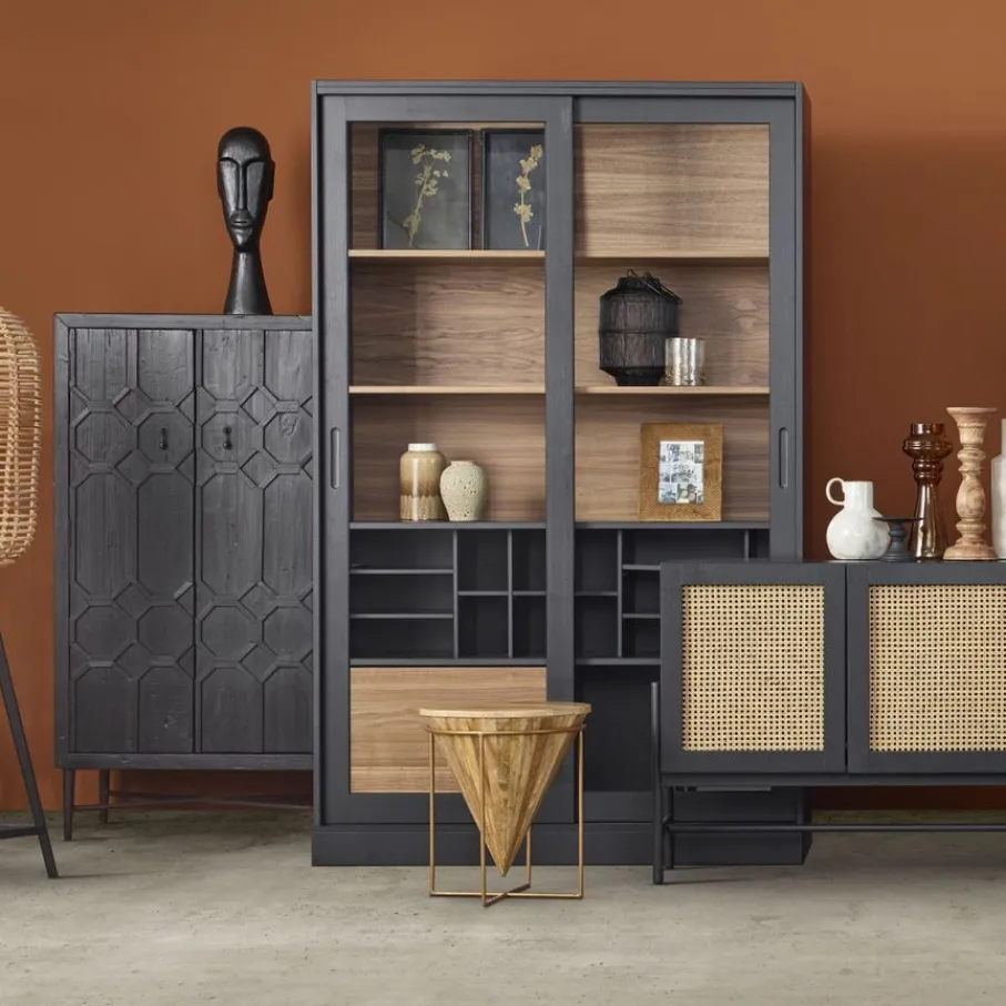 - Verrijk je woonkamer met de trendy look van vitrinekast James. De combinatie van strak zwart met de warme walnootkleur zorgt direct voor een gezellige en moderne sfeer in huis.