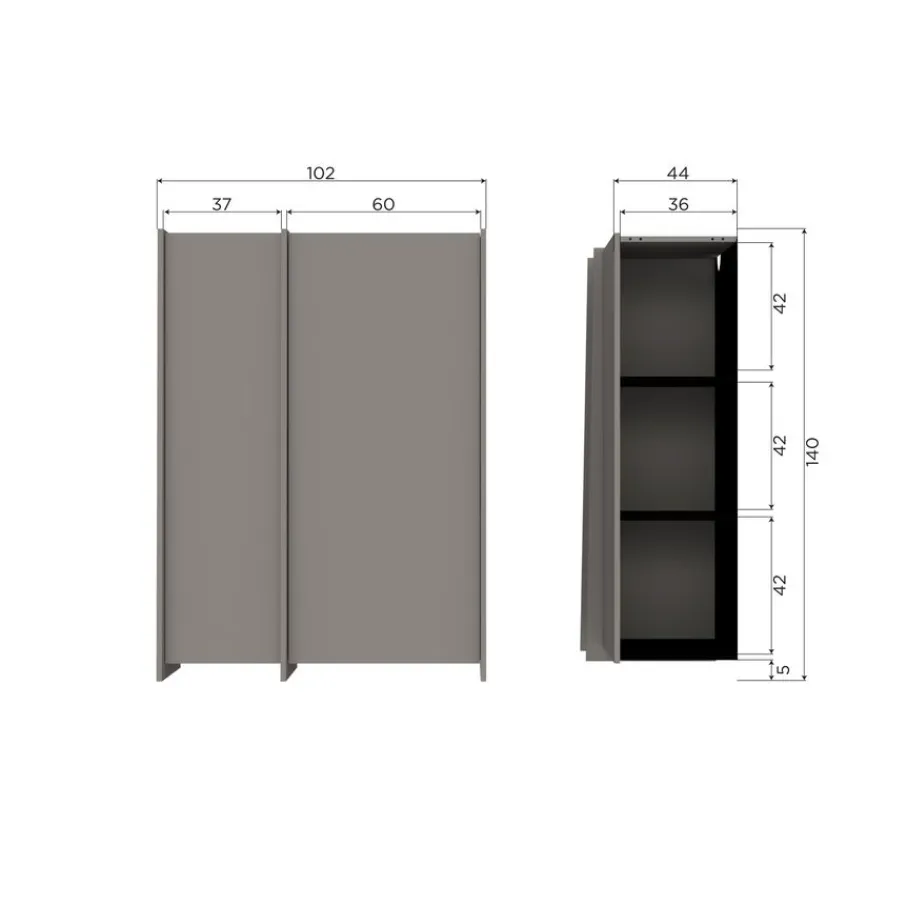 Achter de twee greeploze deuren bevindt zich een zee aan opbergruimte, verdeeld over twee compartimenten. De kast is voorzien van vier legplanken, waardoor je zes ruime vakken hebt om je spullen georganiseerd op te bergen. Het totale draaggewicht van de kast is 45 kg.