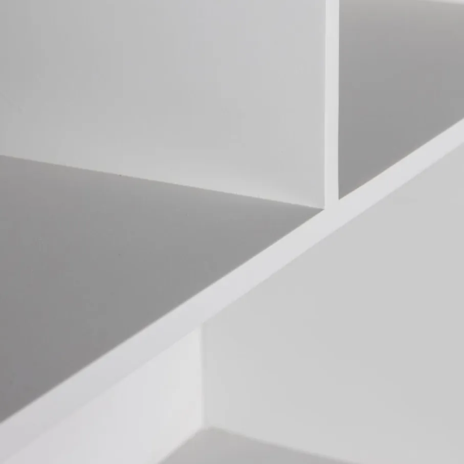 De Carved wandkast heeft bovenin open vakken en onderin een afgesloten vak. Het dichte vak heeft er een plank in ter vakverdeling. Iedere plank heeft een maximale draagkracht van 15 kg. De vijf open vakken zijn perfect om jouw mooiste accessoires tentoon te stellen. De bovenste vier vakken zijn ieder ruim 42 cm breed, het onderste vak heeft een breedte van 86 cm.