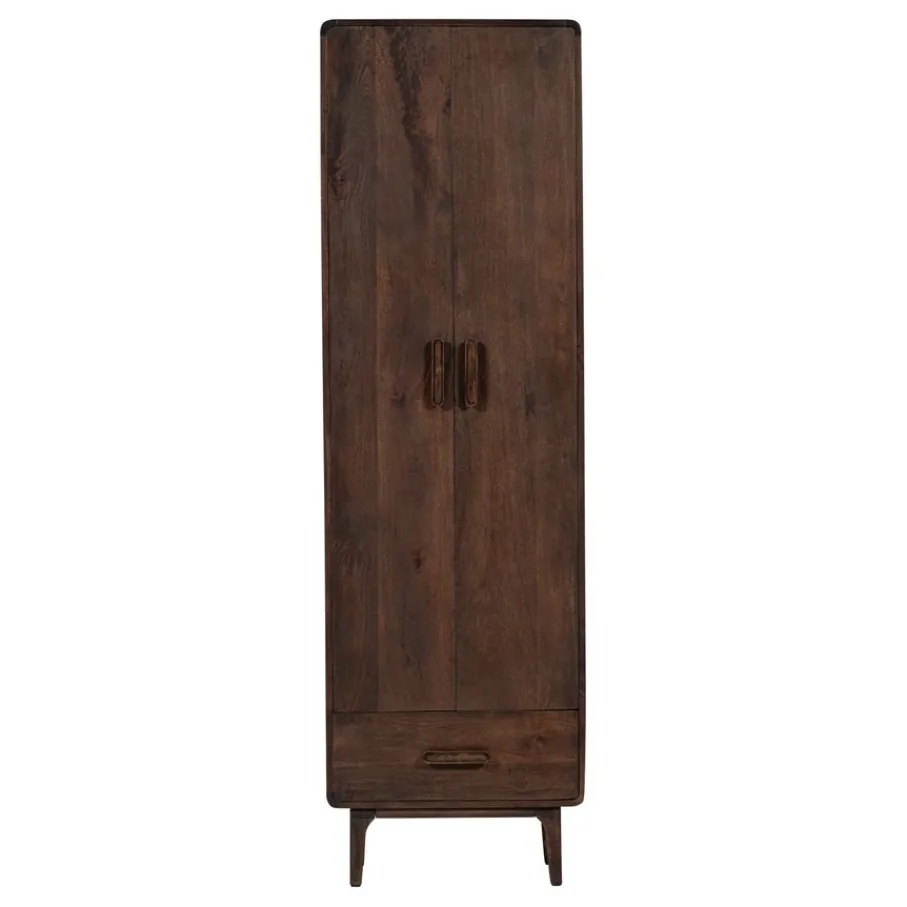 Achter de twee deuren bevinden zich meerdere legplanken die een draaggewicht van 20 kg per plank hebben, wat zorgt voor royale opbergruimte. Onderaan is een lade voor extra opbergmogelijkheden. De wandkast staat op vier poten die het geheel een luchtige uitstraling geven.