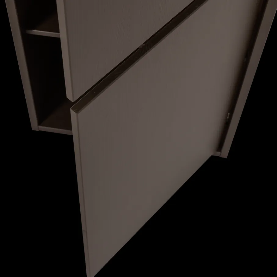 Wandkast Meggy biedt vijf vakken achter twee deuren. Zo is er ruime opbergmogelijkheid. De deuren zijn greeploos en voorzien van een modern push-to-open systeem.