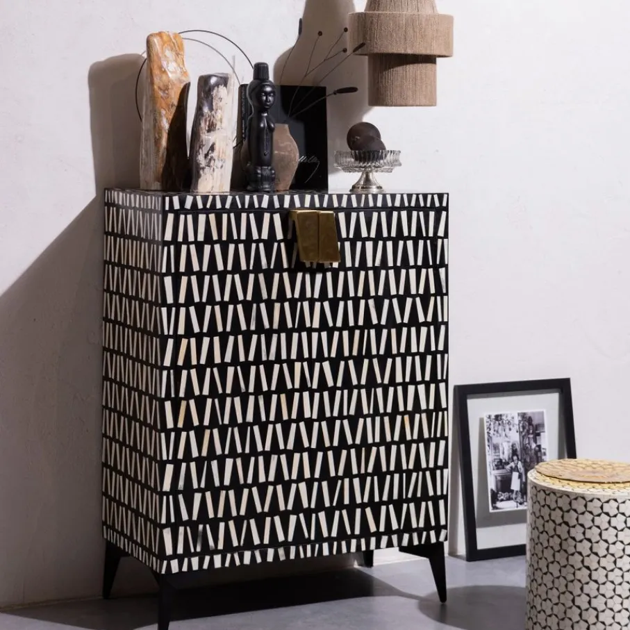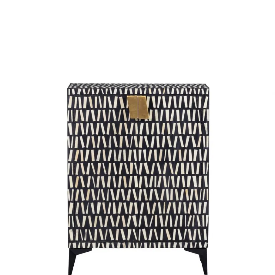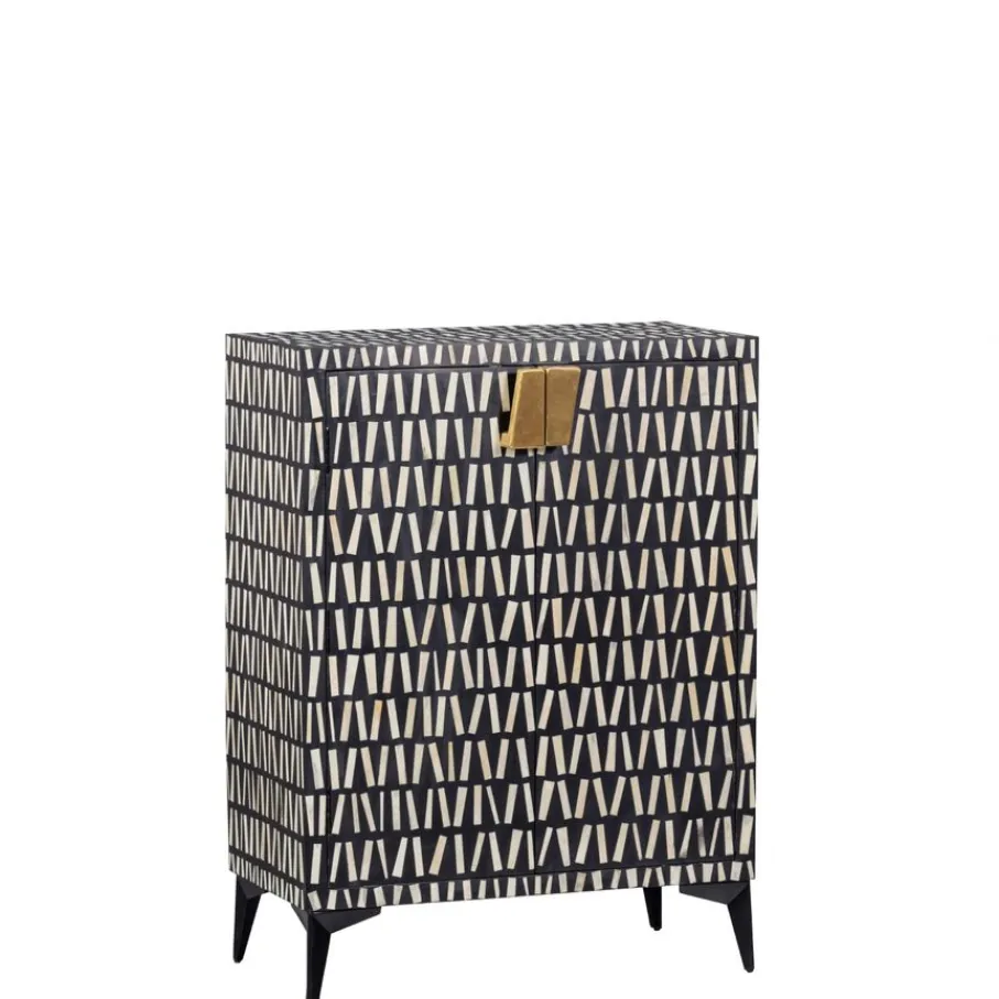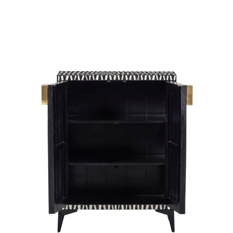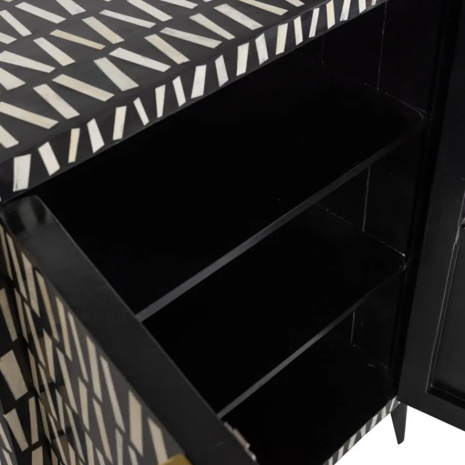 - Laat je interieur stralen met wandkast Menne, een ware blikvanger dankzij de unieke ‘bone inlay’ buitenzijde en de opvallende antique brass handgrepen.