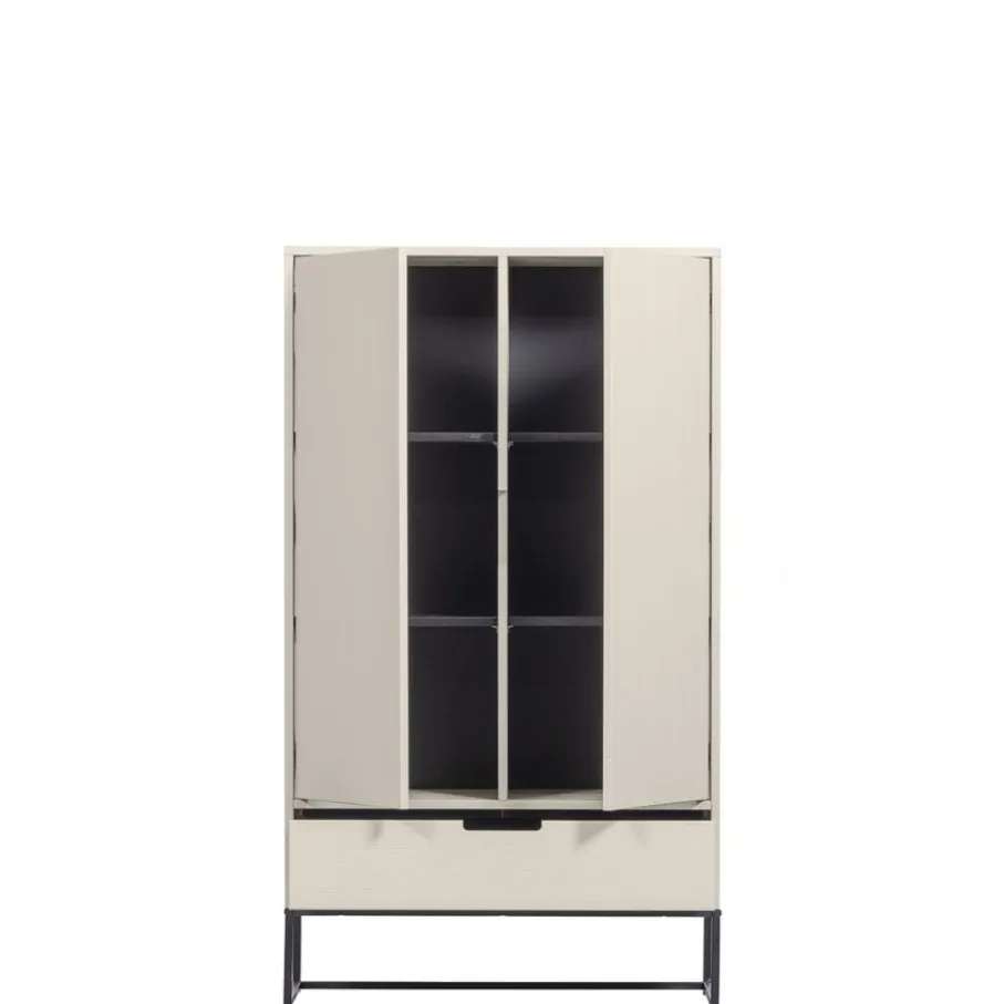 De wandkast heeft 2 grote deuren, daarachter vind je 2 planken. Elke plank heeft een draaggewicht van 15 kg. De grote lade onderin is 31 cm diep en 13 cm hoog. De deuren en lade van de kast hebben zwart metalen handgrepen.