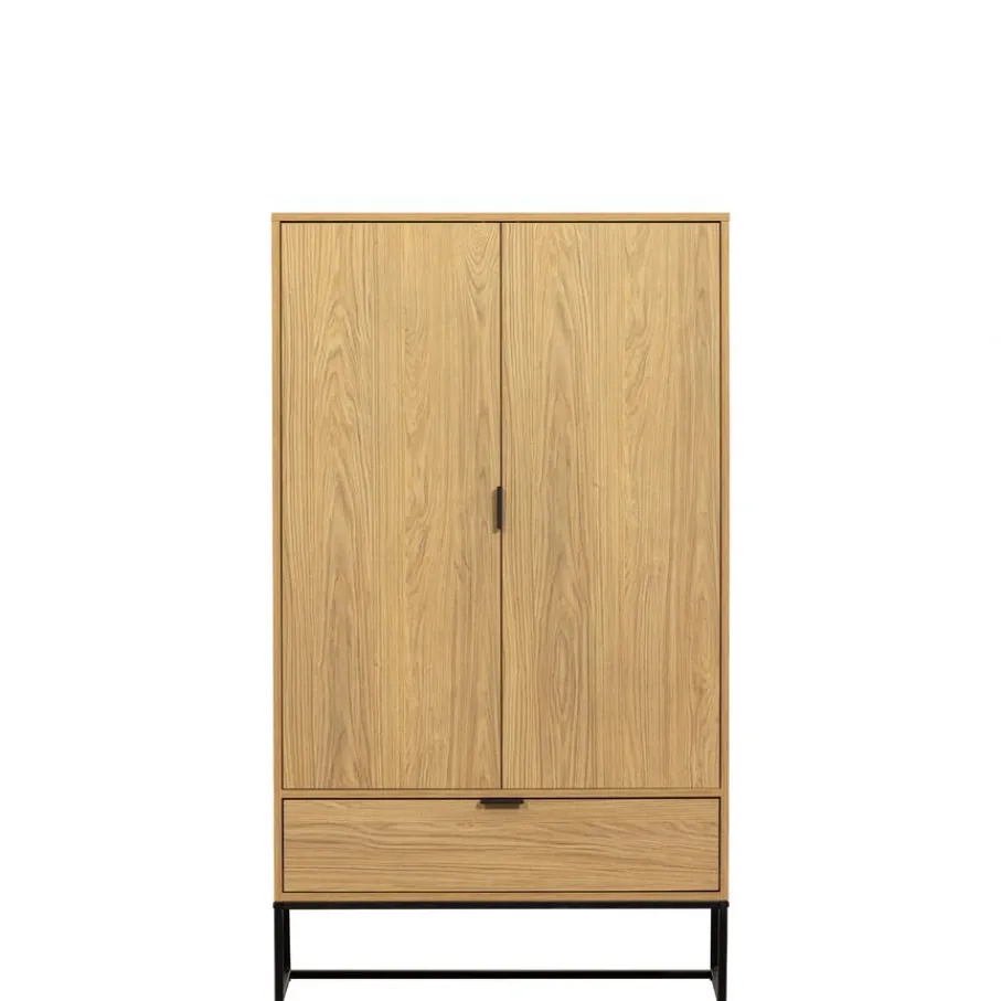 De wandkast heeft 2 grote deuren, daarachter vind je 2 planken. Elke plank heeft een draaggewicht van 15 kg. De grote lade onderin is 31 cm diep en 13 cm hoog. De deuren en lade van de kast hebben zwart metalen handgrepen.