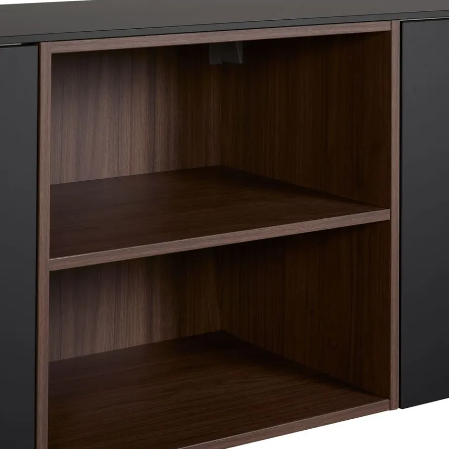 - Geef je interieur een stijlvolle boost met het strakke grafietzwarte design, sfeervol gecombineerd met warme noten houtlook open vakken.