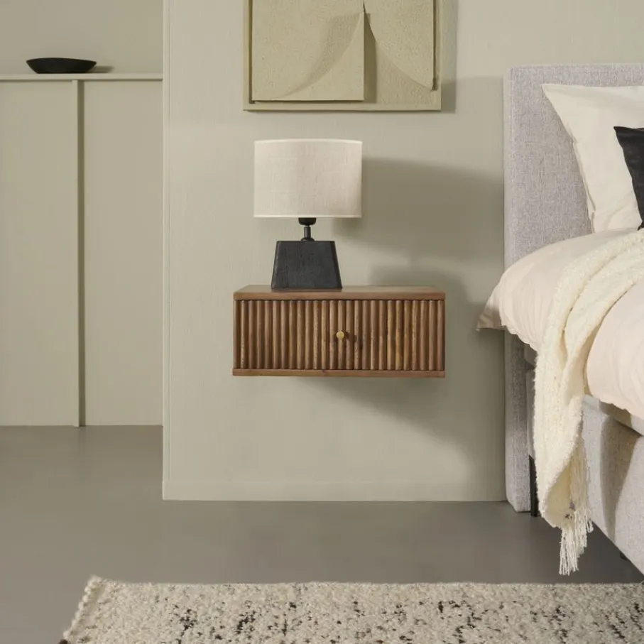 Nachtkastje Sem is voor gemonteerd, het moet wel nog aan de wand gehangen worden. Dat werkt eenvoudig, met een paneel wat je aan de wand monteert. Het kastje en het paneel hebben beide een schuine zijde, die perfect in elkaar passen. Hierdoor is het ophangen van nachtkastje Sem een koud kunstje.